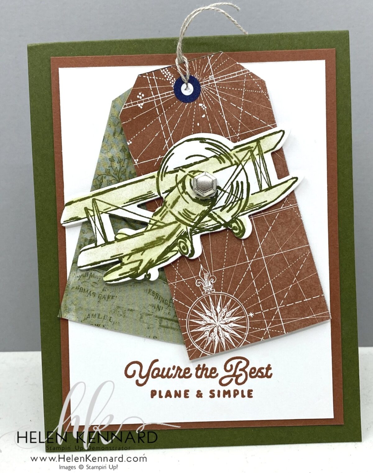 - Stamp plane on Basic White with Mossy Meadow Ink and color with Wink Of Stella. Die Cut and adhere to base with Dimensionals.