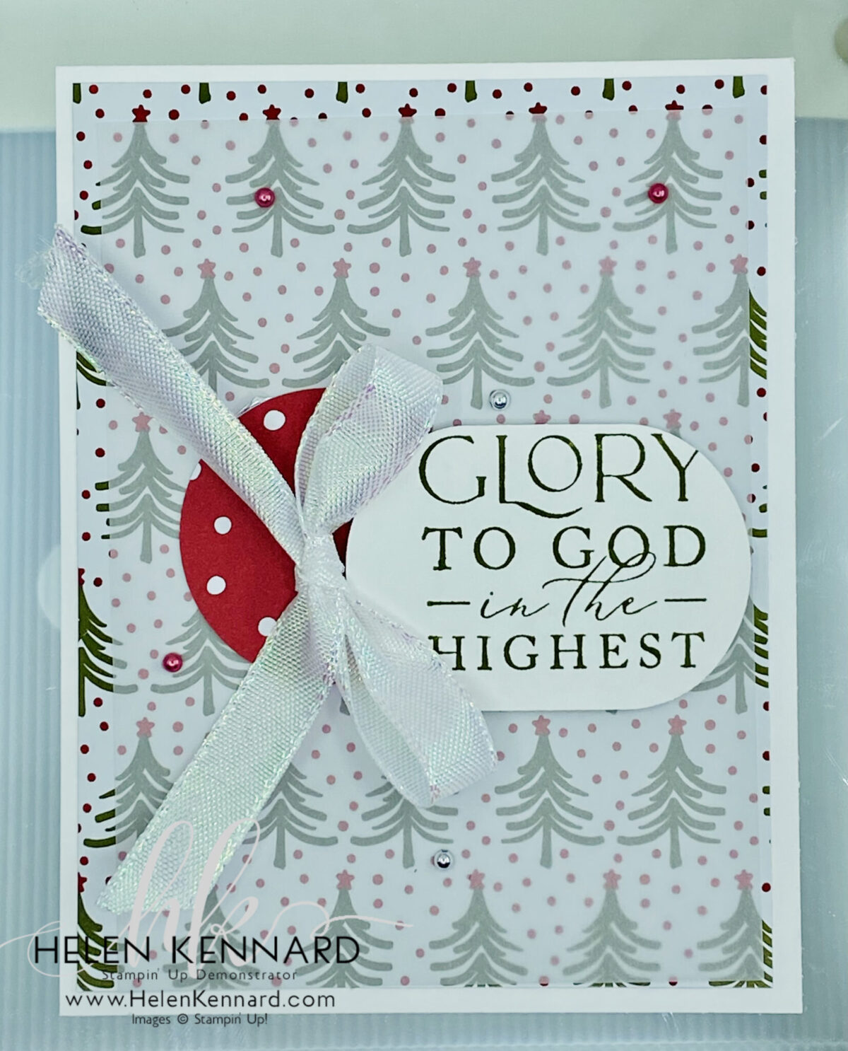 - Wrap Iridescent White Ribbon around card front, thread through tag holes and tie a bow.